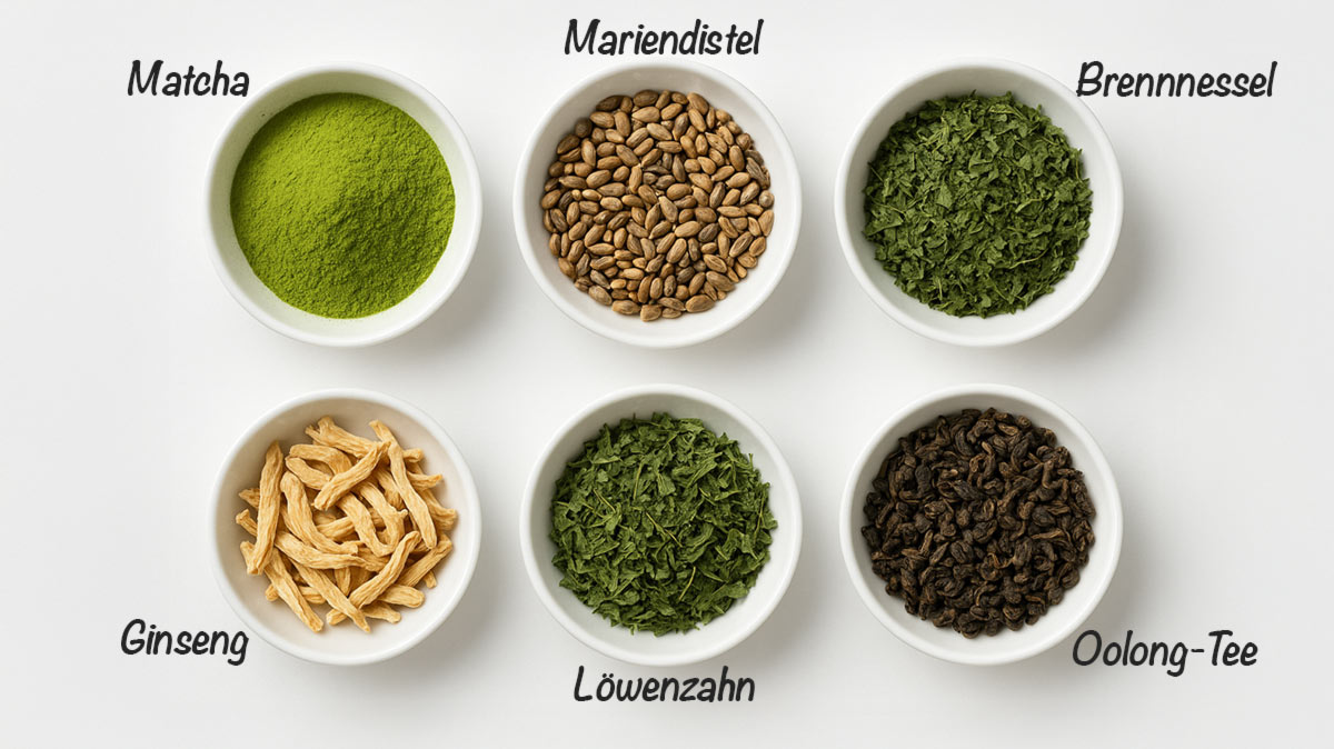 Zutaten (Beispiel): Sencha-Grüntee, Brennnesselblätter, Oolong-Tee, Löwenzahnblätter, Gojibeeren, Yerba Mate, Zitronengras, Mariendistel, Guarana, Pfirsicharoma, Ginseng, Zitronensäure, Steviablätter, Matcha-Grüntee